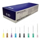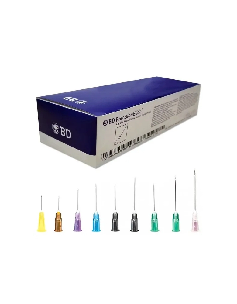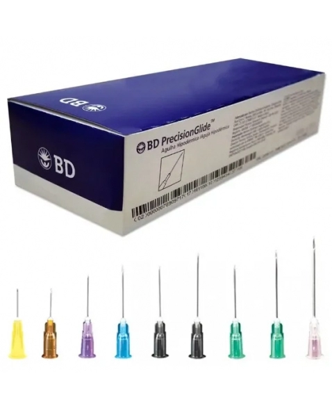 Agulha hipodérmica, estéril, descartavel, de uso único para uso geral em procedimentos terapêuticos. Agulha de parede fina constituida por cânula de aço inox tipo 304, siliconizada,bisel trifacetado, canhão colorido e protetor de plástico. Esterilizado a óxido de etileno.