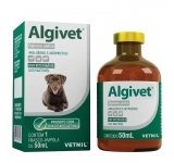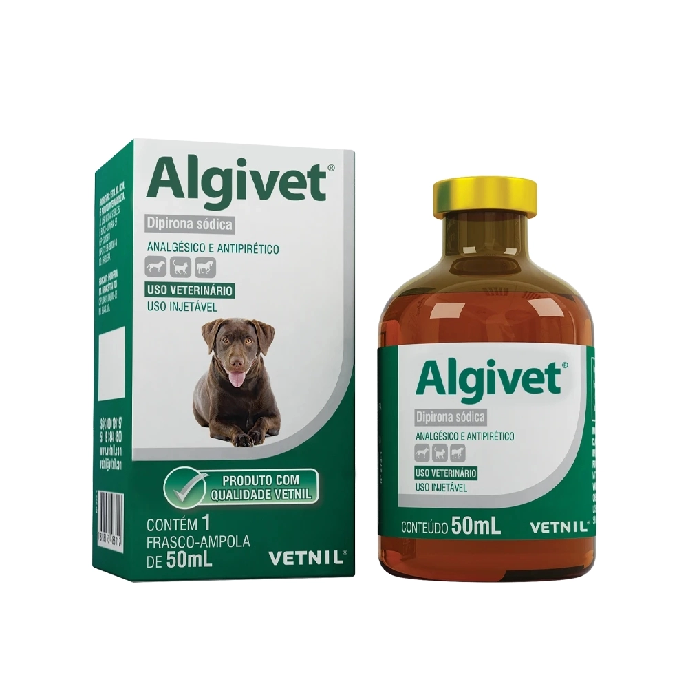 Algivet® contém Dipirona, um derivado da pirazolona, não narcótico e não esteroide, com elevada ação analgésica, antipirética (antitérmica) e espasmolítica. O mecanismo responsável pelo efeito analgésico é complexo e mais provavelmente seja devido a inibição central da cicloxigenase-3 (COX-3) e ativação dos sistemas opioidérgico e canabinóide. A Dipirona pode bloquear ambas as vias prostaglandina-dependente e prostaglandina-independente da febre induzida por LPS, o que sugere que esta droga tenha um perfil de ação antipirética distinto dos anti-inflamatórios não esteroides. A Dipirona também apresenta ação espasmolítica (Gulmez et al. 2006, Hinz et al. 2007), através da inibição da liberação do Ca2+ intracelular, como resultado da redução da síntese do fosfato de inositol.