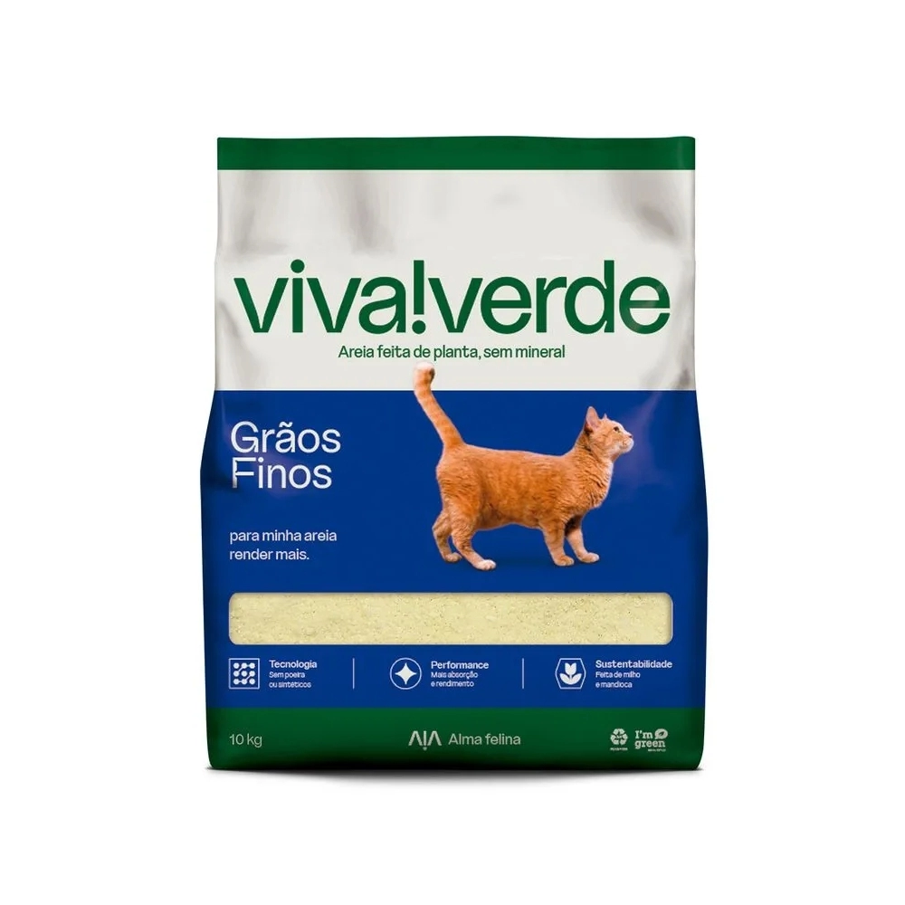 A Viva!Verde Grãos Finos não deixa cheiro e oferece o máximo da eliminação do odor de urina com melhor absorção e rendimento. Feita apenas de milho e mandioca, é livre de poeira, indicada por médicos veterinários, além de ser a areia higiênica preferida do Encantador de Gatos, Jackson Galaxy.
