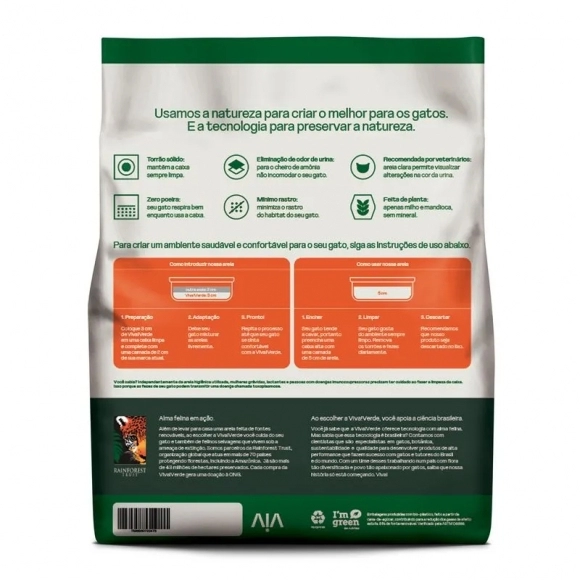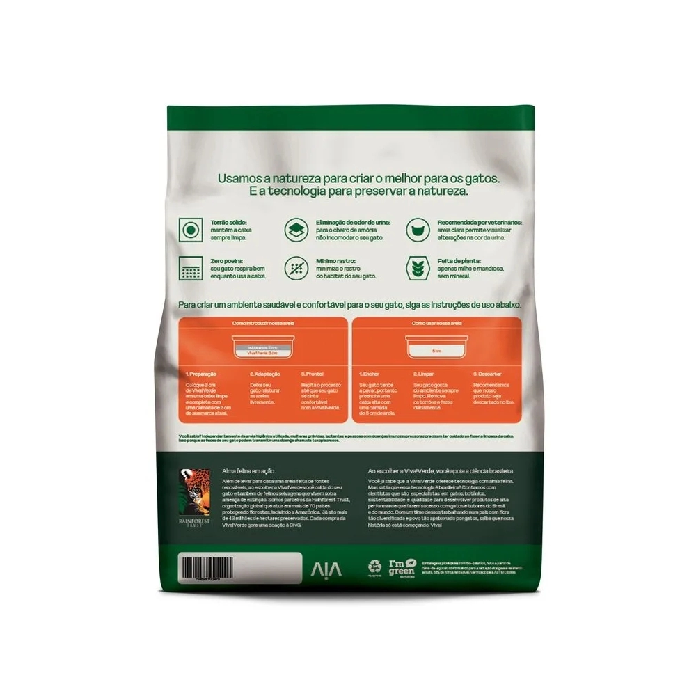 A Viva!Verde Grãos Grossos não faz sujeira e promove a eliminação do odor de urina com mínimo rastro. Feita apenas de milho e mandioca, é livre de poeira, indicada por médicos veterinários, além de ser a areia higiênica preferida do Encantador de Gatos, Jackson Galaxy.