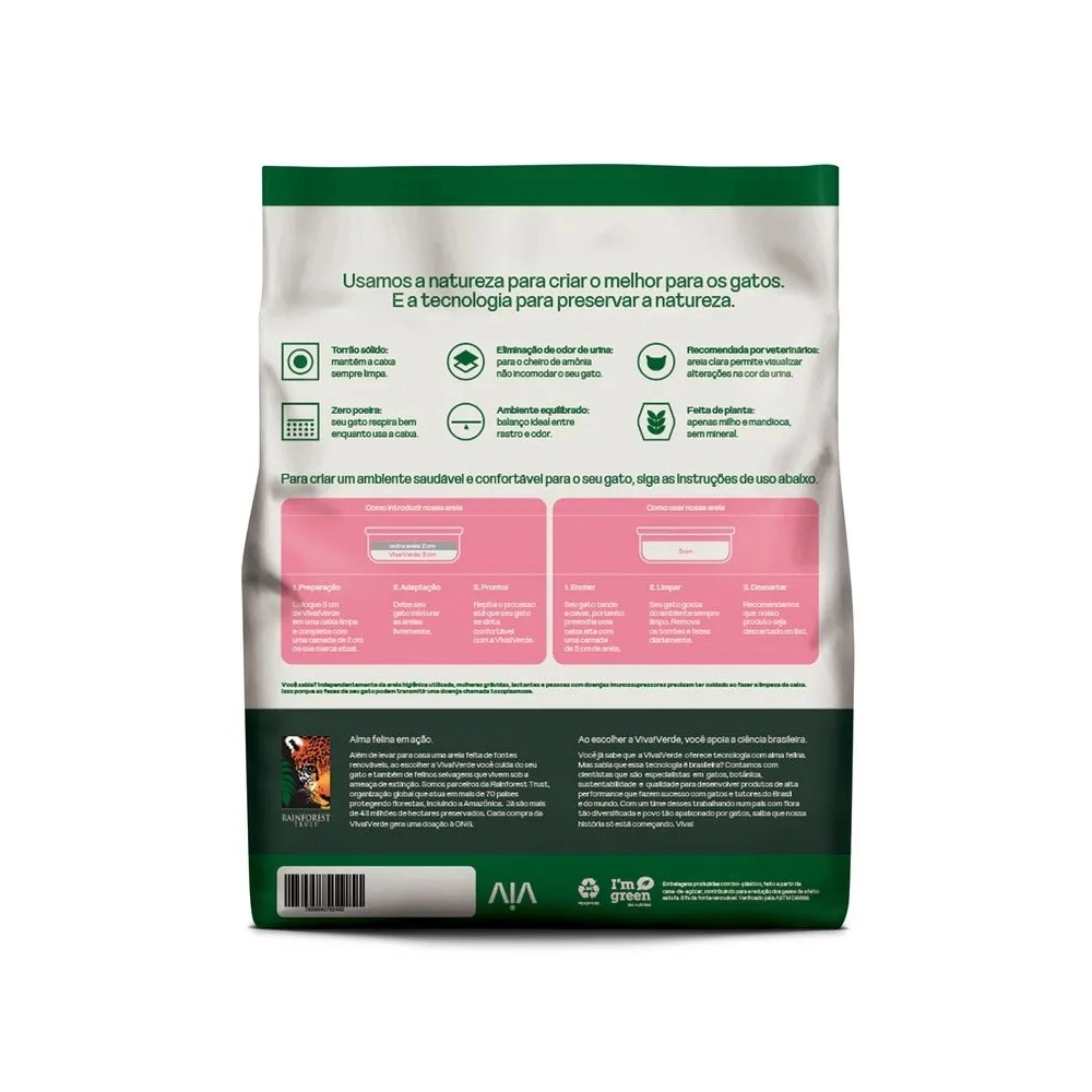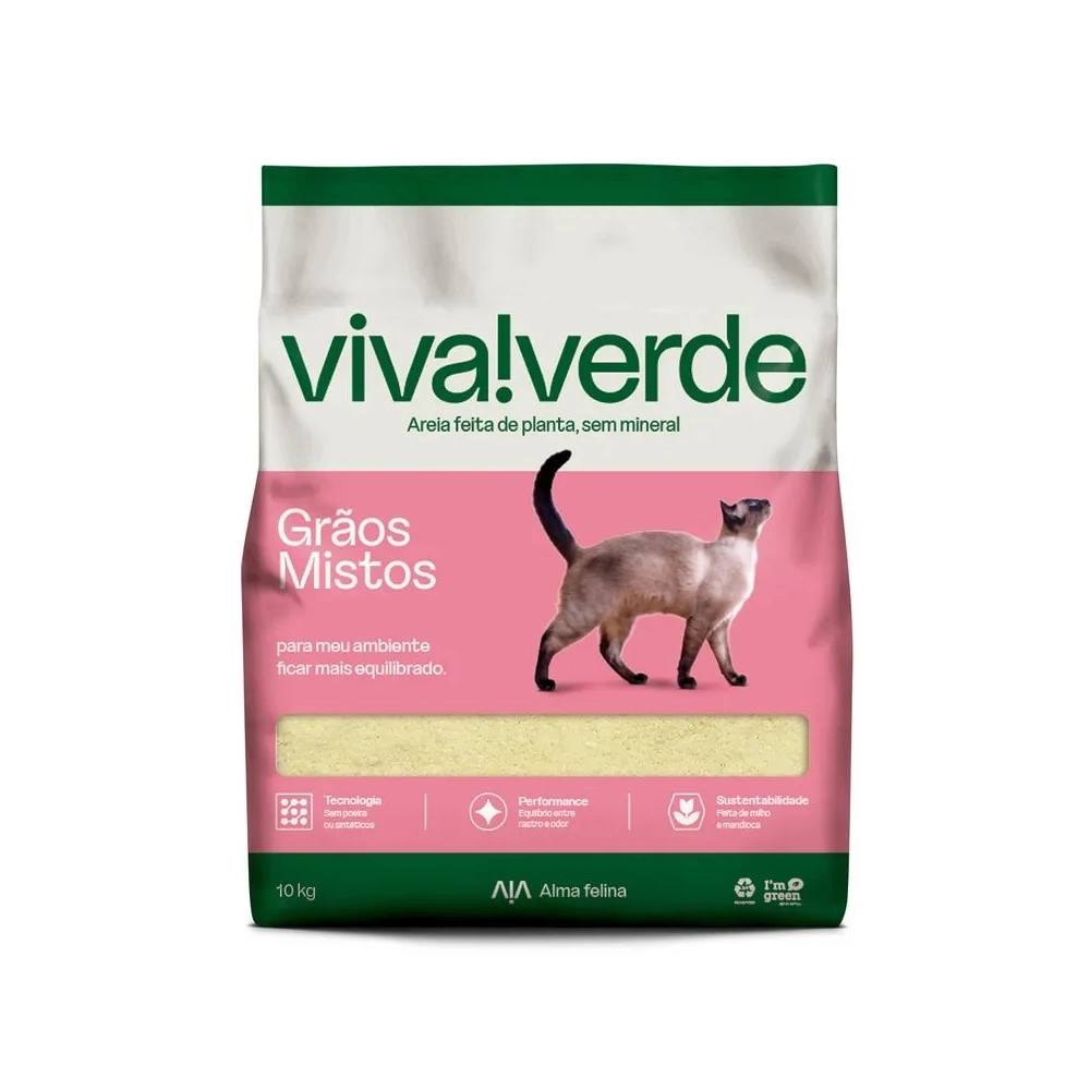 A Viva!Verde Grãos Mistos representa o equilíbrio entre controle de rastro e eliminação do odor de urina. Feita apenas de milho e mandioca, é livre de poeira, indicada por médicos veterinários, além de ser a areia higiênica preferida do Encantador de Gatos, Jackson Galaxy.