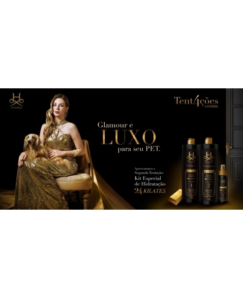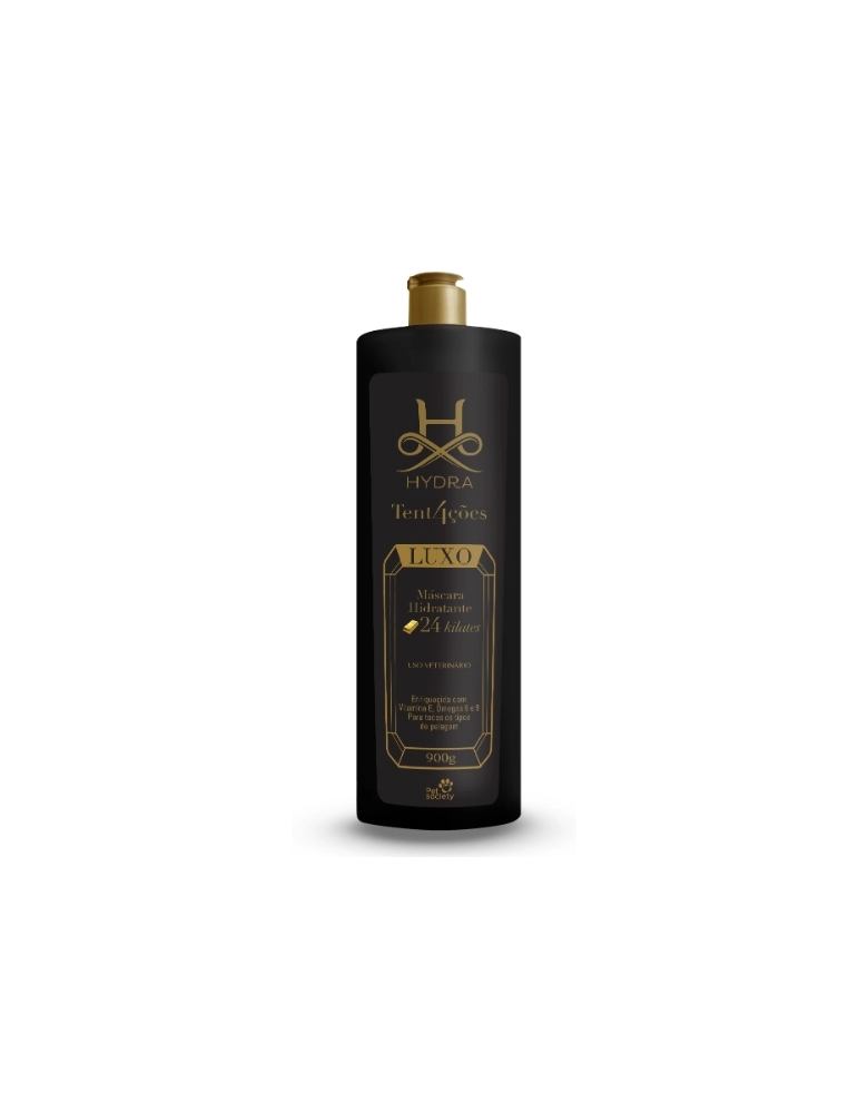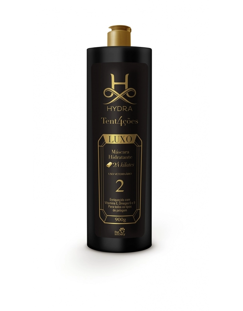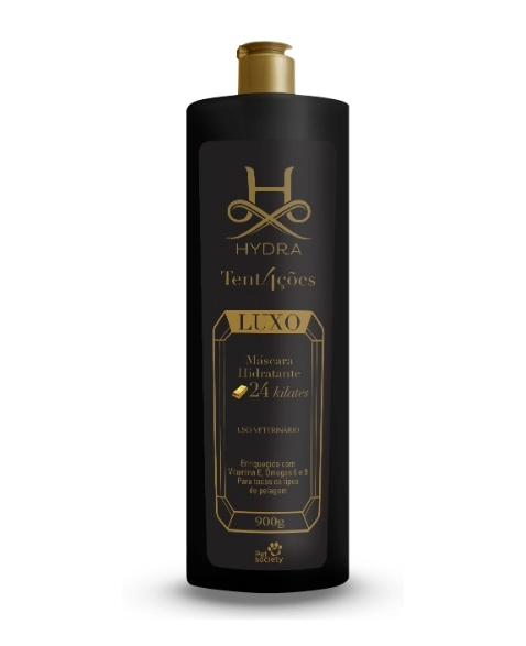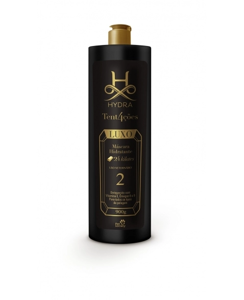 Modo de Uso: Uso tópico. Banhe o animal com o Hydra Tent4ções Luxo Shampoo Hidratante 24 kilates e enxágue. Aplique a Hydra tent4ções Luxo Máscara Hidratante 24 Kilates na pelagem, massageando bem.
