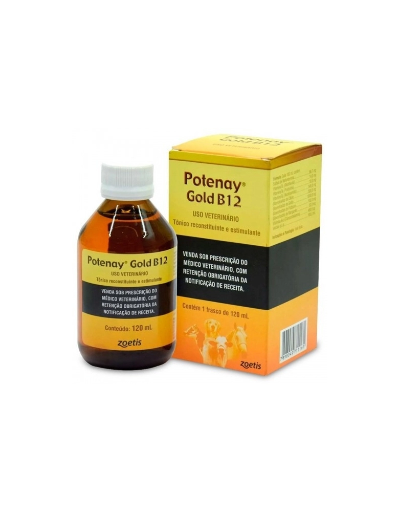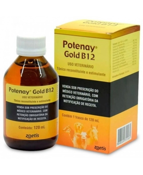 Potenay Gold B12 é formulada com vitaminas, aumentando o tônus muscular e estimulando o sistema circulatório. pode ser usado em animais mesmo quando não for identificada a causa primária específica. Indicado para fraqueza, fadiga, estresse, abatimento, anemia, desnutrição, convalescença de enfermidades infecciosas e parasitárias. Como tônico reconstituinte durante os períodos de gestação e lactação.