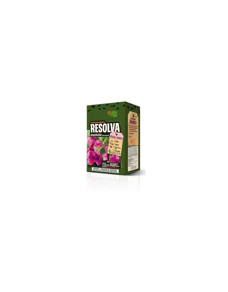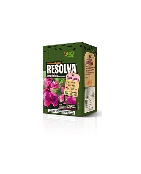 RESOLVA INSETICIDA é uma linha que combate as principais pragas que atacam as plantas. Seu uso é recomendado para o tratamento quando a planta apresenta até mesmo uma alta infestação de pragas precisando de cuidados imediatos. Cada envelope de RESOLVA INSETICIDA HIDROSSOLÚVEL pode fazer até 5L de calda. Por ser hidrossolúvel, não requer contato direto com o produto.