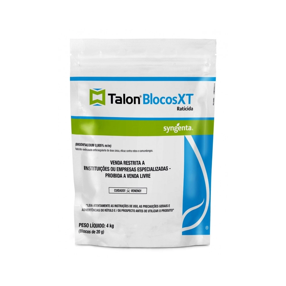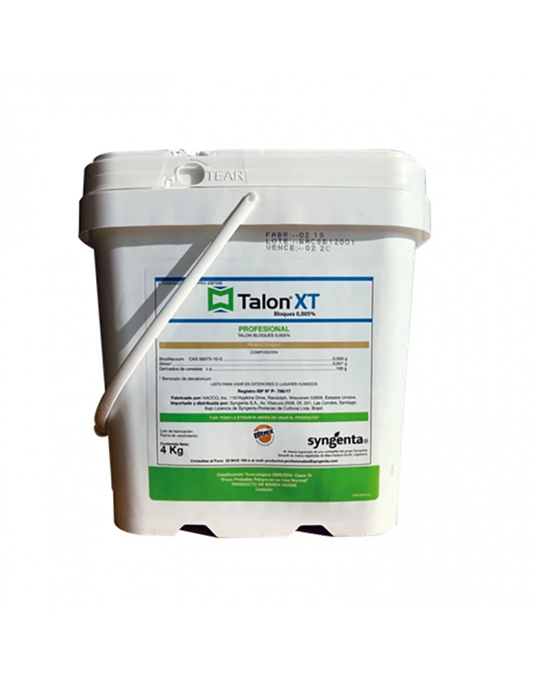 É um raticida anticoagulante desegunda geração, de dose única e que não é recoberto por parafina, à base de Brodifacoum. Composto por cereais com a mais alta qualidade e palatabilidade, TALON BLOCO XT é produzido nos Estados Unidos por meio de uma inovadora tecnologia de extrusão que permite iscas muito mais atrativas e com alta resistência a fatores externos.