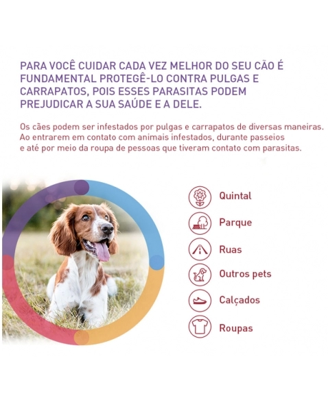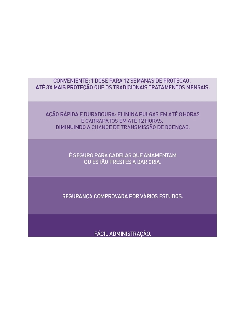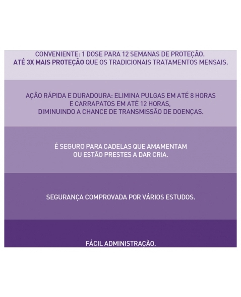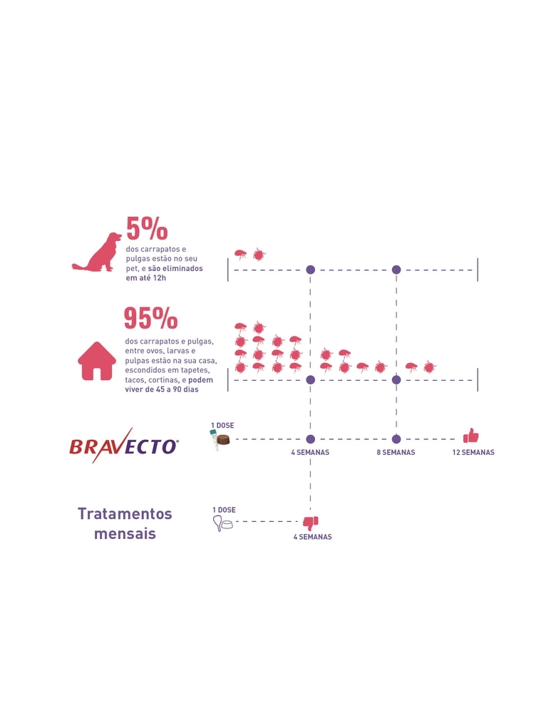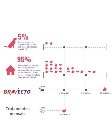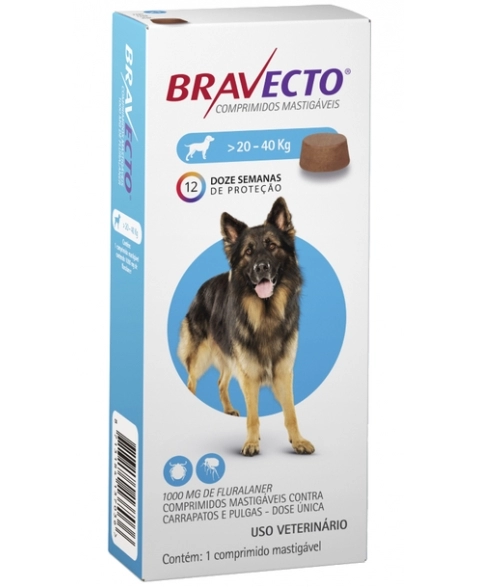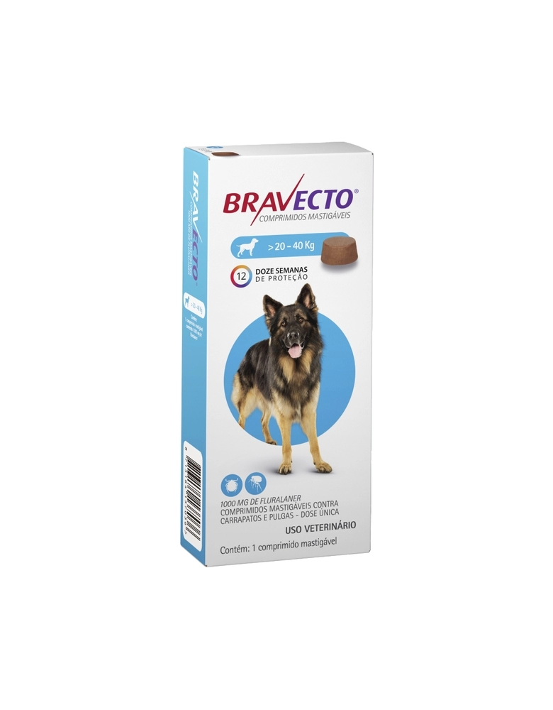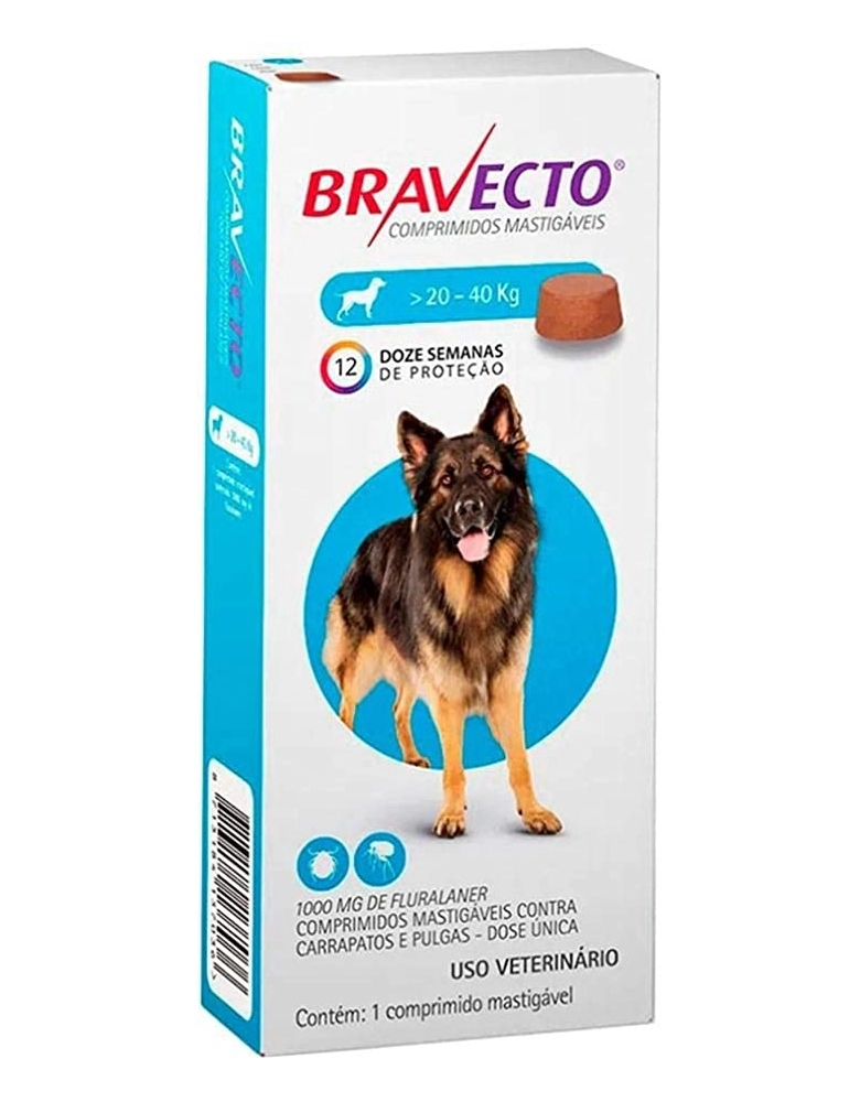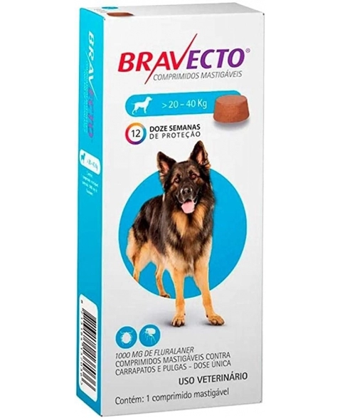 Antipulgas e Carrapatos MSD Bravecto para Cães de 20 a 40 Kg é um primeiro comprimido mastigável, indicado para o tratamento de infestações por carrapatos e pulgas, em cachorros, proporcionando 12 semanas de proteção. É um inseticida e acaricida, sistêmico com longa duração de ação, que promove eficácia imediata e persistente por 12 semanas contra carrapatos (formas adultas e jovens de ixodes ricinus, ixodes hexagonus, ixodes holocyclus, Ixodes scapularis dermacentor reticulatus, dermacentor variabilis e rhipicephalus sanguineus) e pulgas (ctenocephalides felis e ctenocephalides canis). Pulgas e carrapatos devem estar aderidos ao cachorro, e já tendo iniciada a alimentação para serem expostos ao princípio ativo. O início da ação é rápida dentro de 8 horas para pulgas e 12 horas para carrapatos. O produto pode ser utilizado como parte de uma estratégia de tratamento para a dermatite alérgica à picada de pulgas.