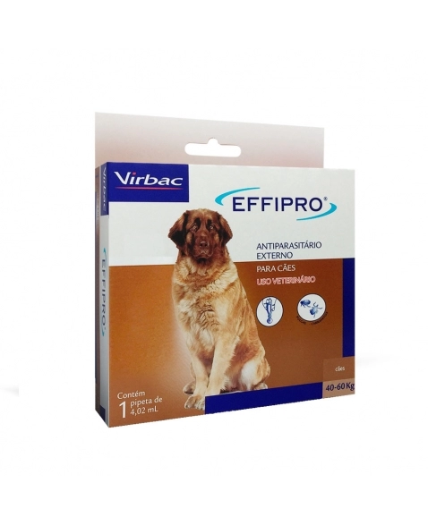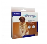 O Antipulgas e Carrapatos Virbac Effipro Cães de 40 até 60 Kg, é um inseticida e carrapaticida a base de fipronil, pertencente à família dos fenilpirazóis. Atua inibindo o complexo do ácido gama-aminobutírico (GABA), bloqueando, deste modo, a transferência pré e pós sináptica dos íons de cloro com os canais de cloro através das membranas celulares. Isto resulta na atividade não controlada do sistema nervoso central e morte dos insetos e carrapatos.