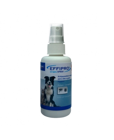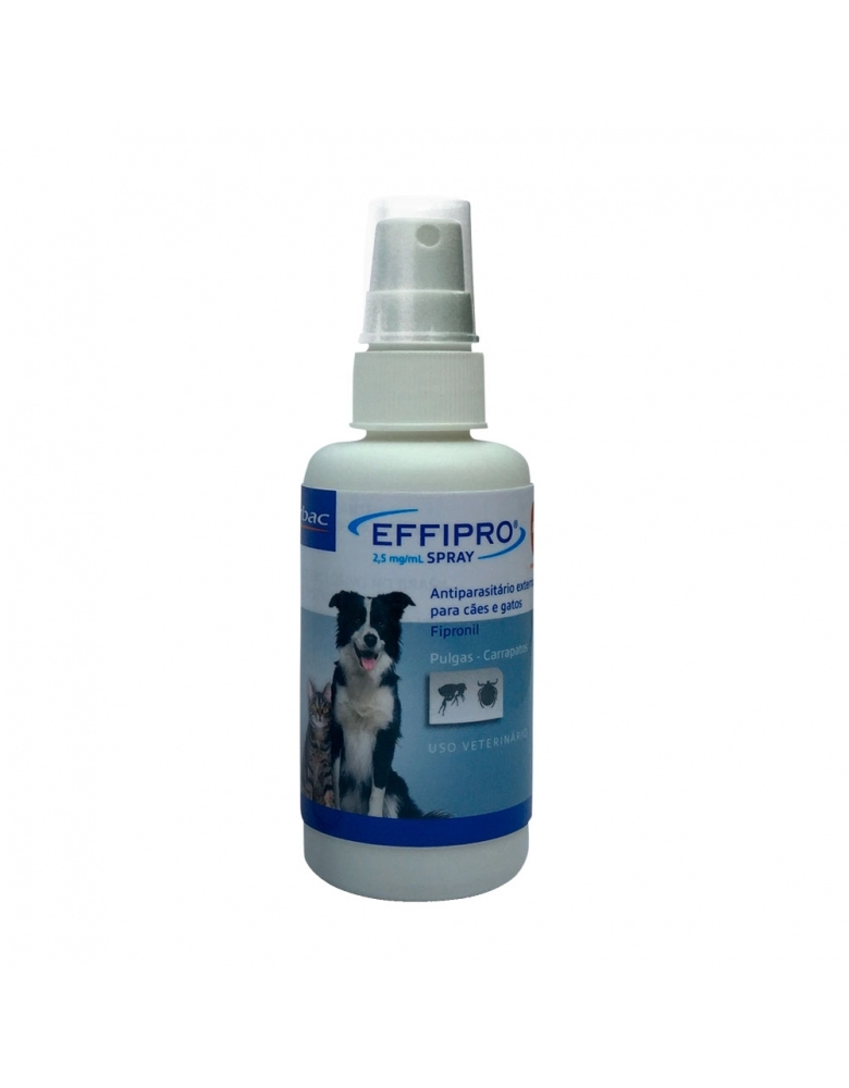 O Antipulgas e Carrapatos Virbac Effipro Spray para Cães e Gatos é um acaricida à base de fipronil, pertencente à família dos fenilpirazois. É indicado para o tratamento e prevenção de infestações por pulgas (Ctenocephalides spp) e carrapatos (Rhipicephalus sanguineus), como parte de uma estratégia de tratamento para Dermatite Alérgica a Picada de Ectoparasitas (DAPE) dos cães e gatos. A eficácia contra novas infestações por pulgas adultas é de até 4 semanas em cães e gatos, dependendo do desafio ambiental submetido.