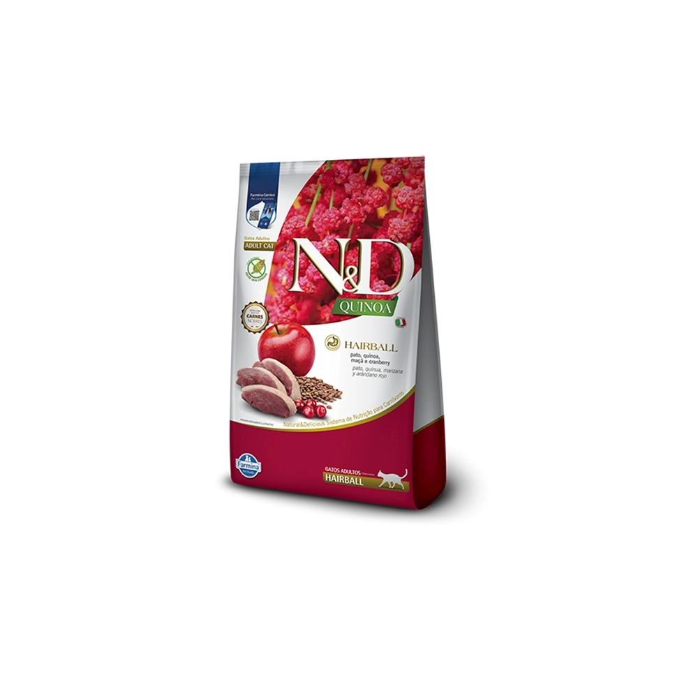 Pato (carne mecanicamente separada de pato, farinha de pato – mín. 10%), farinha de vísceras de aves, farinha de peixe, farinha de torresmo, óleo de peixe, óleo de frango, ovo em pó, amido de batata, amido de mandioca, grão de quinoa (mín. 5%), polpa de beterraba, alfafa desidratada, celulose em pó, casca de ervilha, semente de linhaça, levedura seca de cervejaria, semente de psyllium, maçã desidratada (mín. 0,5%), arando (cranberry) desidratado (mín. 0,1%), espinafre desidratado, extrato de aloe vera, aditivos prebióticos (FOS e MOS), beta caroteno, DL-metionina, L-lisina, taurina, L-carnitina, sulfato de condroitina, sulfato de glicosamina, aditivos adsorventes (extrato de yucca e zeolita), hidrolisado de fígado de aves e suínos, vitaminas (A, D3, E, B1, B2, B5, B6, B12, C, biotina, niacina, ácido fólico, cloreto de colina), fosfato bicálcico, cloreto de potássio, cloreto de sódio, carbonato de cálcio, cloreto de amônio, ferro aminoácido quelato, cobre aminoácido quelato, zinco aminoácido quelato, manganês aminoácido quelato, proteinato de selênio, iodato de cálcio, propionato de cálcio, concentrado de tocoferóis.