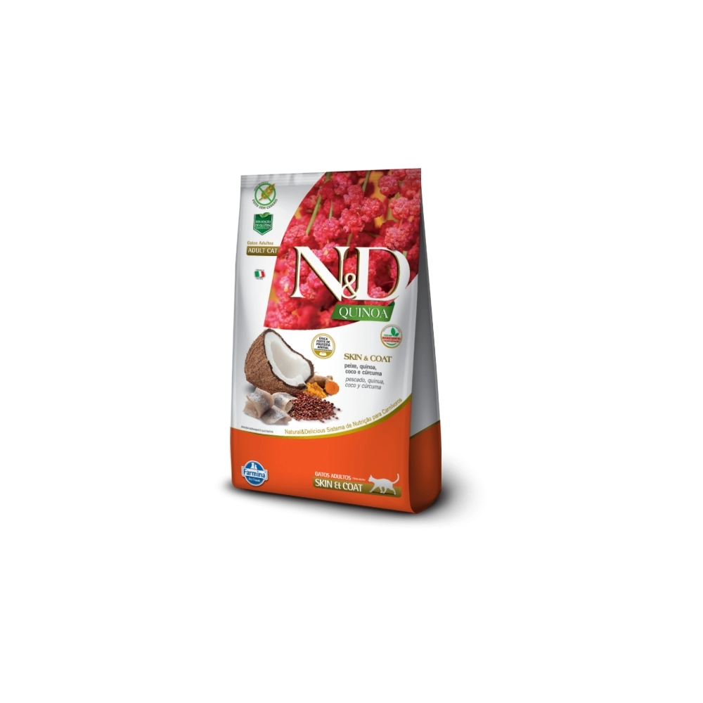 carne de peixe (mecanicamente separada), farinha de peixe (mín. 15%), quinoa (mín. 5%), amido de batata, amido de mandioca, óleo de frango, óleo de peixe, semente de psyllium, semente de linhaça, levedura seca de cervejaria, coco desidratado (mín. 0,15%), cúrcuma em pó (mín. 0,15%), extrato de chá verde, extrato de aloe vera, beta caroteno, aditivos prebióticos (FOS e MOS), DL-metionina, taurina, L-carnitina, sulfato de condroitina, sulfato de glicosamina, aditivo adsorvente (zeolita), hidrolisado de fígado de frango e suíno, vitaminas (A, D3, E, B1, B2, B6, B12, C, biotina, niacina, ácido pantotênico, ácido fólico, cloreto de colina), cloreto de potássio, carbonato de cálcio, fosfato bicálcico, ácido fosfórico, ferro aminoácido quelato, cobre aminoácido quelato, zinco aminoácido quelato, manganês aminoácido quelato, proteinato de selênio, iodato de cálcio, propionato de cálcio, concentrado de tocoferóis.