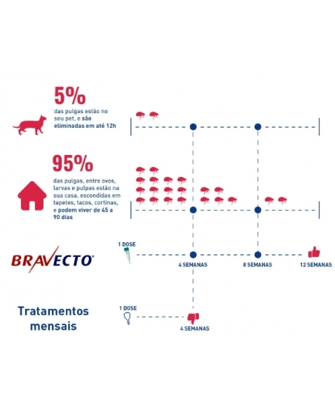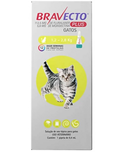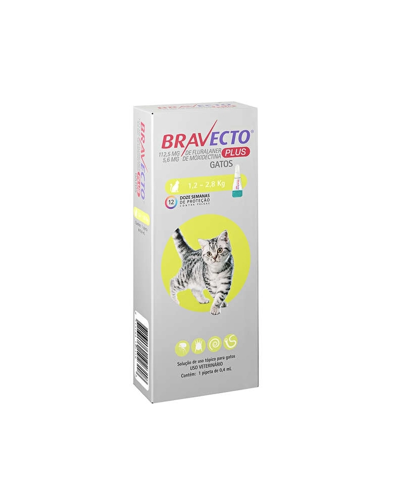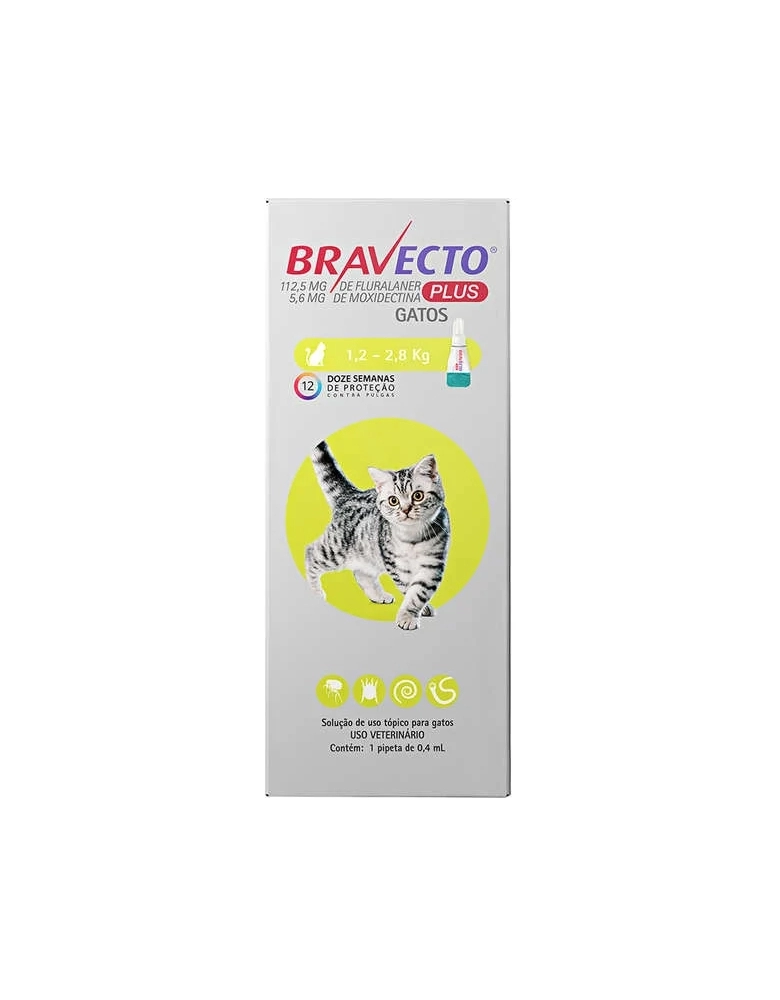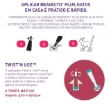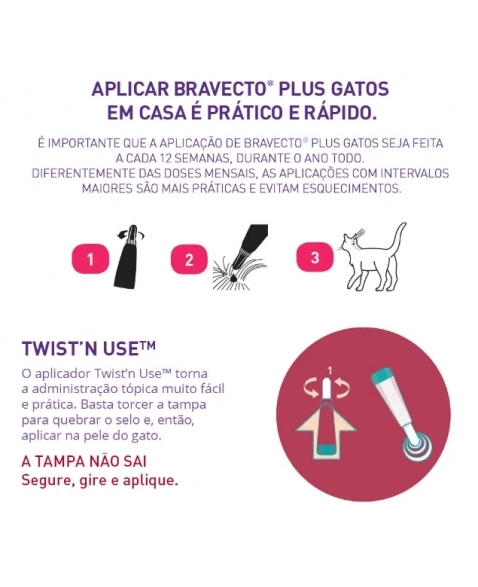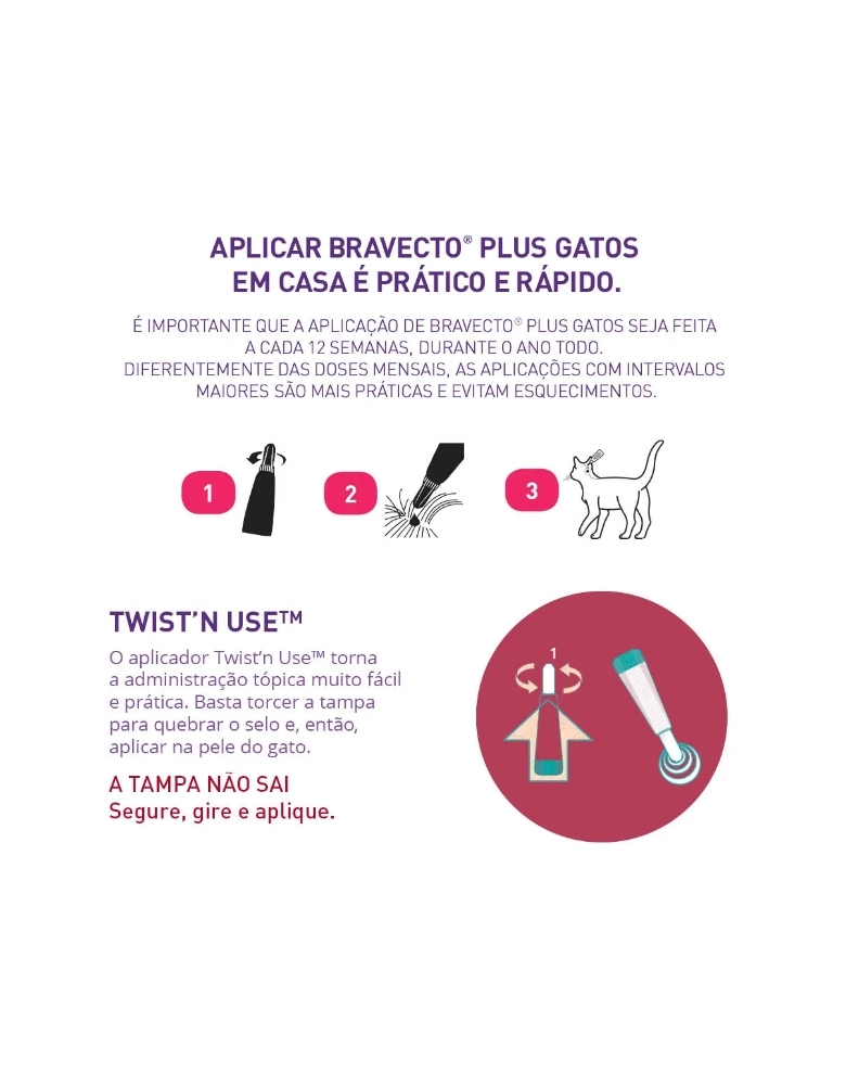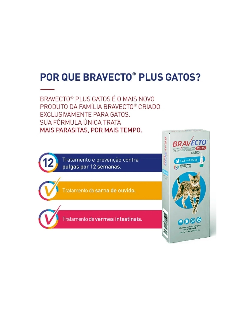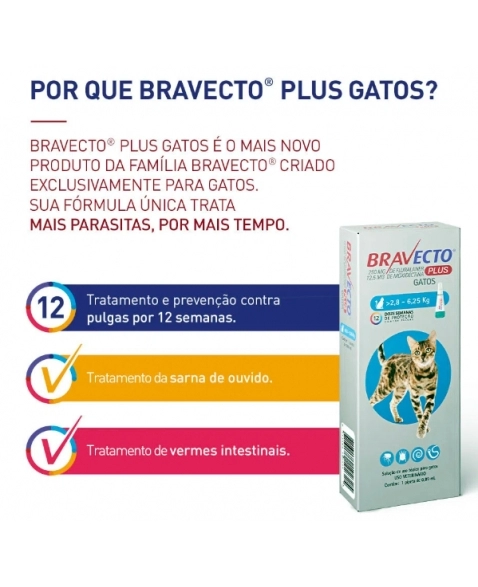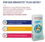 Para gatos com ou em risco de infestações parasitárias mistas por pulgas e nematódeos gastrointestinais (vermes de Toxocara cati, Toxascaris sp, e Ancylostoma tubaeforme) e ácaros de orelha (Otodectes cynotis). BRAVECTO® PLUS GATOS é indicado quando o uso contra pulgas e um ou mais dos outros parasitas-alvo são indicados ao mesmo tempo.