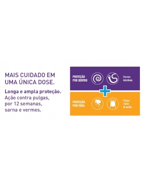 No tratamento de infestações por pulgas (Ctenocephalides felis) em gatos, proporciona atividade de eliminação persistente por 12 semanas, que devem começar a se alimentar no hospedeiro para serem expostas aos princípios ativos, portanto o risco de transmissão de doenças causadas por pulgas não pode ser excluído.
