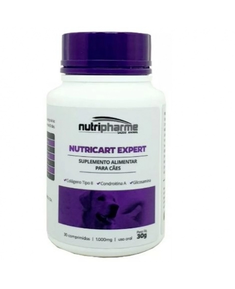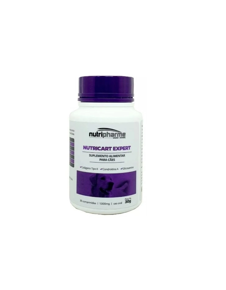 Nutricart Expert é um suplemento alimentar para cães de todas as idades com sulfato de Condroitina, Glucosamina e Colágeno Tipo II Não Desnaturado.