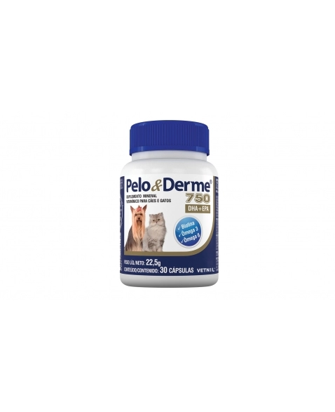 Pelo e Derme 750 DHA + EPA é um suplemento que atua na derme e pelos de cães e gatos, para diminuir a queda de pelos e fortalecer a pele e pelos dos animais.