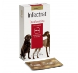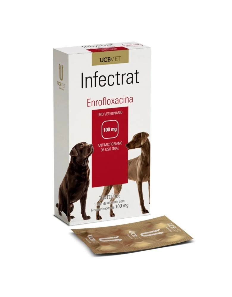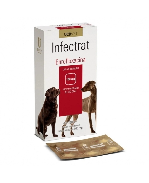 Antimicrobiano Infectrat (Enrofloxacina) 100mg C/ 6 comp. UCBVET- É indicado para cães no tratamento de infecções causadas por microrganismos sensíveis à enrofloxacina, tais como: Staphylococcus intermedius, Staphylococcus aureus, Staphylococcus epidermitis, Streptococcus canis, Escherichia coli, Proteus mirabilis, Bordetella bronchiseptica (tosse dos canis), Pasteurella multocida, e Mycoplasma canis.