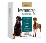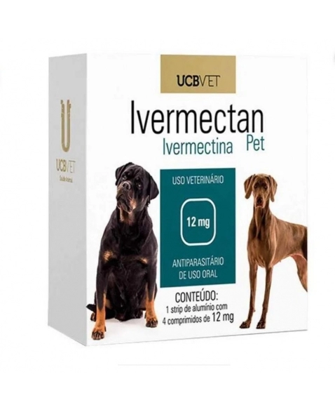 Ivermectan Pet (Ivermectina) 12mg C/4 comp. UCBVET- É indicado para cães no tratamento de sarna sarcóptica (Sarcoptes scabiei), sarna demodécica (Demodex canis) e verminoses gastrointestinais causadas pelo Ancylostoma sp, Toxocara canis e Trichuris sp.