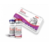 Caixas contendo 5 frascos com fração liofilizada (antígenos atenuados) contra Parvovirus canino e vírus da Cinomose canina; acompanhados de 5 frascos de 0,5 mL de fração líquida (diluente estéril).