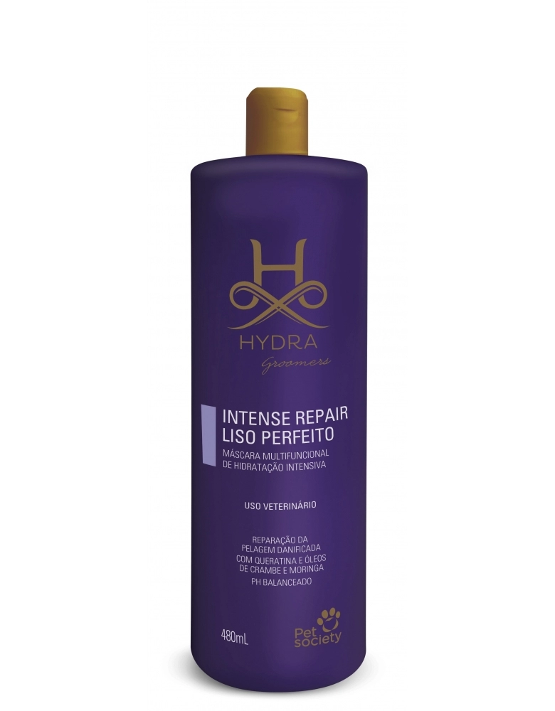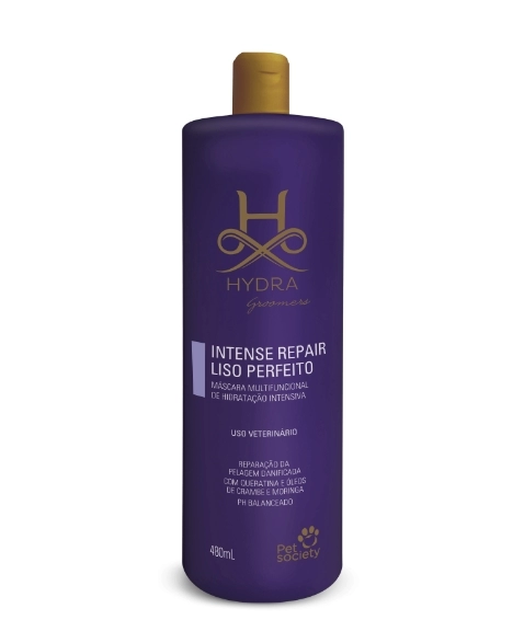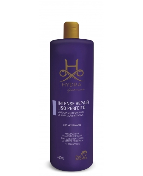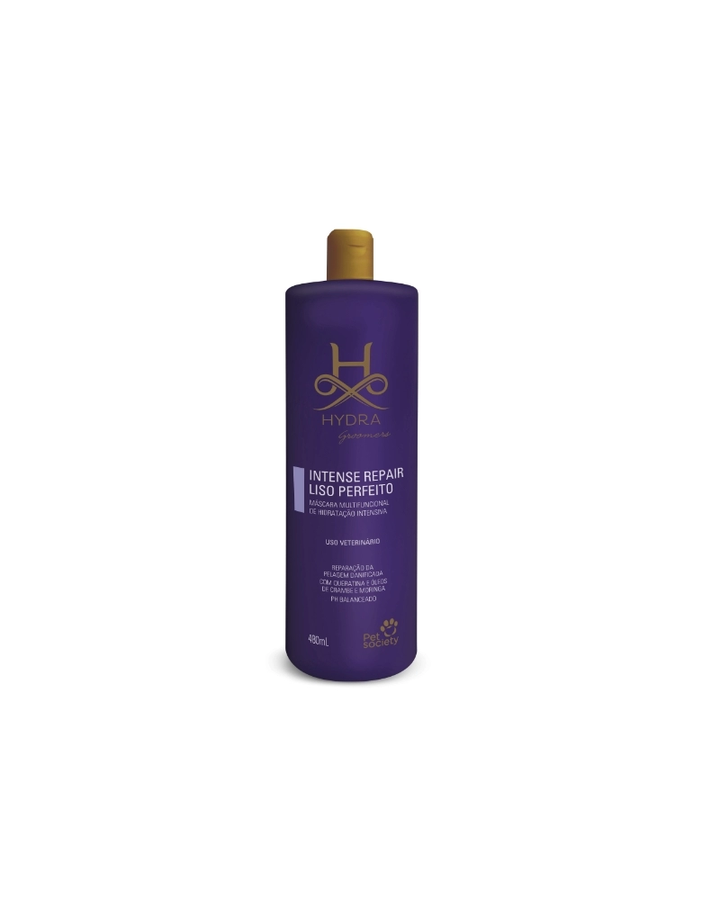 Frasco de 480mL Modo de Uso: Uso tópico. Banhe o animal com o Hydra Shampoo mais adequado e enxágue. Aplique a máscara Hydra Intense Repair Liso Perfeito por toda a pelagem, massageando bem, no sentido de crescimento dos pelos. Deixe agir por 5 minutos e enxágue bem.