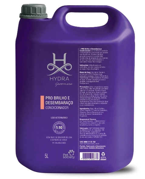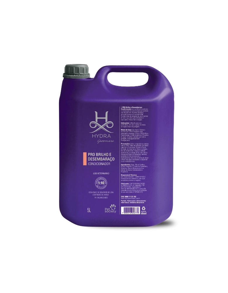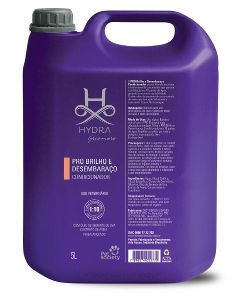 Modo de Uso: Uso tópico. Banhe o animal com o Hydra Shampoo mais adequado e enxágue. Dilua 1 parte do Hydra PRO Condicionador Brilho e Desembaraço em 10 partes de água. Espalhe o produto por toda a pelagem, massageando bem. Enxágue bem.