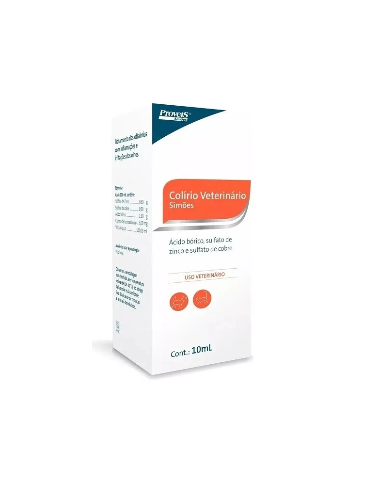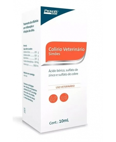 Colírio Veterinário Simões da fabricante Provets divido a sua ação adstringente, anti-séptica e descongestionante, encontra larga aplicação nas inflamações da conjuntiva e pálpebras, na turvação dos olhos, lacrimejamentos por poeira, cansaço visual ou excesso de luz solar, bem como nas secreções catarrais e purulentas, enfim, para proteção, limpeza e descongestionamento dos olhos dos animais, inclusive aves.