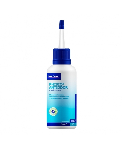 Limpador Auricular Phisio Anti -Odor - 100 mL é uma solução coloidal não espumante e isotônica, que assegura excelente tolerância para a limpeza das orelhas de cães e gatos. O pH fisiológico (idêntico ao da pele do animal) do produto possibilita seu uso frequente.