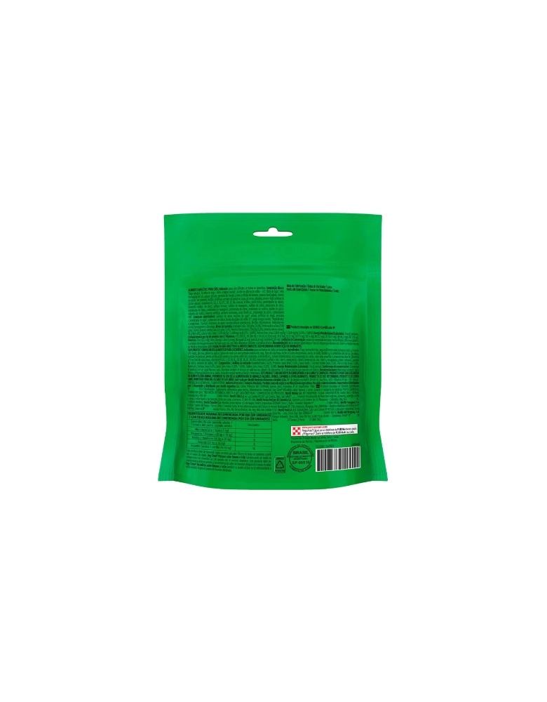 Trigo integral, farinha de trigo, milho integral moído*, farelo de glúten de milho – 60*, fibra de soja*, leite desnatado em pó, açúcar, glicose, gordura de frango, aroma artificial de banana, banana desidratada, cloreto de sódio (sal comum), fosfato bicálcico, sorbato de potássio, água, glicerina, gelatina, mono e diglicerídeos de ácidos graxos, vitaminas (A, D3, E, K3, B12, B1, B2, B6, niacina, biotina, ácido fólico, pantotenato de cálcio), minerais (sulfato de zinco, sulfato ferroso, sulfato de manganês, sulfato de cobre, proteinato de zinco, proteinato de ferro, proteinato de manganês, proteinato de cobre, proteinato de selênio, iodato de cálcio, selenito de sódio), corante artificial amarelo tartrazina, ácido fosfórico, propionato de cálcio, antioxidante BHT. Eventuais substitutivos: quirera de arroz, lecitina de soja*, aroma artificial de maça, proteína concentrada de soja*, carbonato de cálcio, farelo de glúten de milho 21*, sorgo integral moído. *Ingredientes transgênicos. Espécies doadoras do gene: Agrobacterium tumefaciens, Bacillus thuringiensis, Streptomyces viridochromogenes e Zea mays