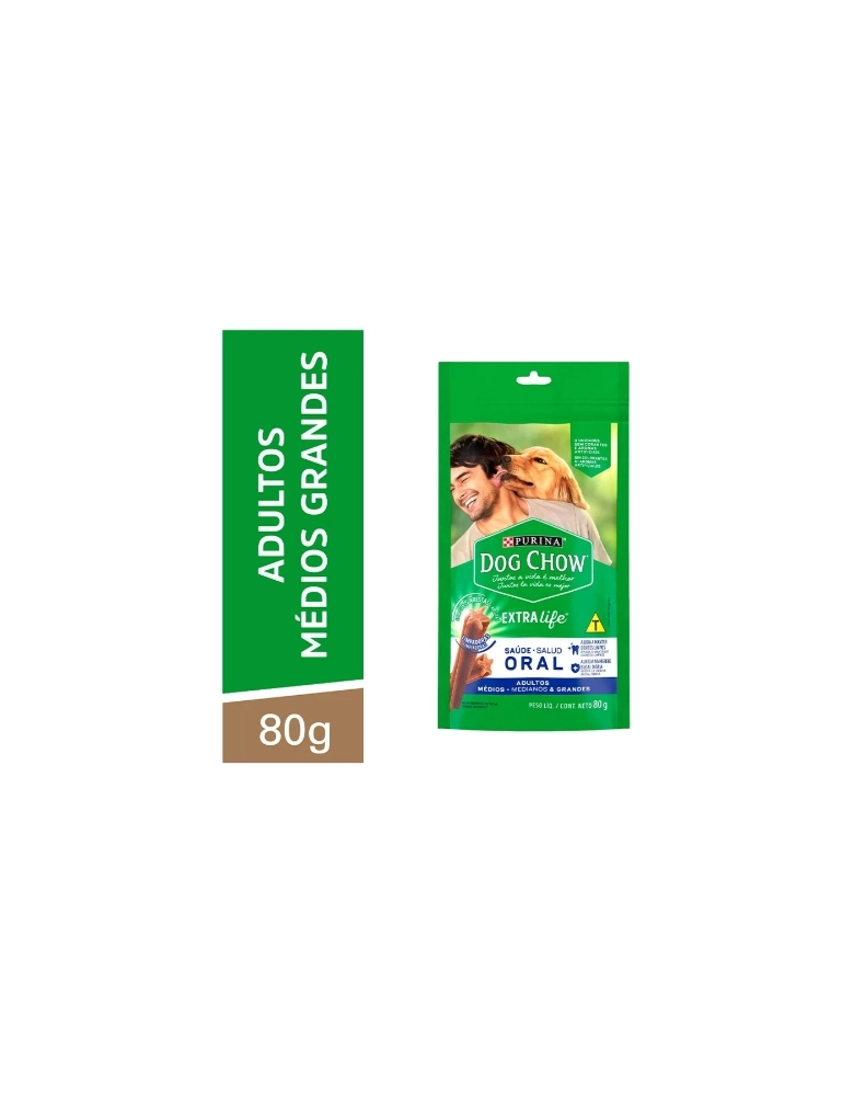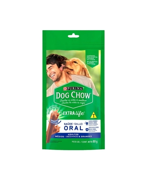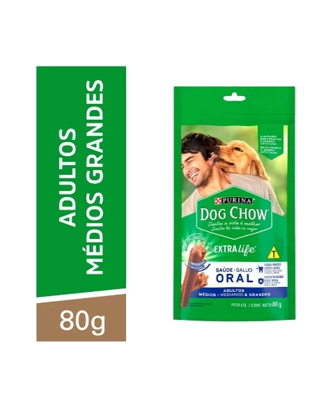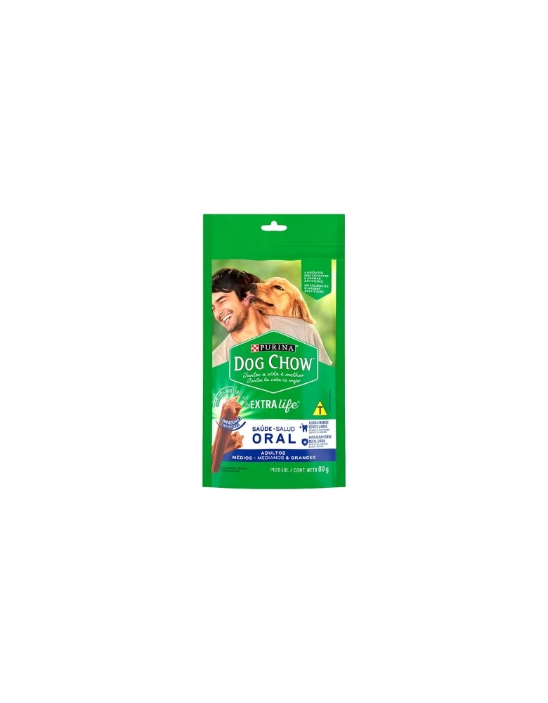 PURINA® DOG CHOW® Oral para cães adultos de tamanhos médios e grandes é um saboroso petisco que ajuda a promover a higiene bucal diária, maximizando a qualidade de vida do seu cão. Elaborado sem corantes e aromas artificiais, ajuda a manter os dentes limpos, saudáveis e fortes. PURINA® DOG CHOW® apresenta agora em todos os produtos ExtraLife®, um mix de antioxidantes, vitaminas e minerais, que ajuda a maximizar a qualidade de vida do seu cão dia após dia. Juntos a vida é melhor.