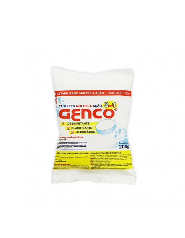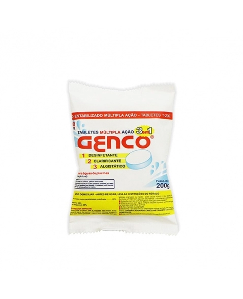 Produto concentrado, contém 85% de cloro ativo. Possui estabilizante que inibe a degradação do cloro pelos raios UV (raios solares). GENCO® TABLETES MÚLTIPLA AÇÃO "3 em 1" apresenta dissolução lenta para cloração contínua e automática. Sua fórmula múltipla ação é recomendada especialmente para quem quer praticidade aliada à qualidade. Poderoso desinfetante (cloro com estabilizante), clarificante, algicida e algistático. Indicado para piscinas residenciais.