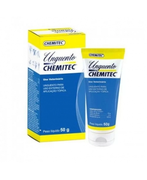 Pomada Cicatrizante Unguento Chemitec®, cicatrizante de lesões provocadas pela castração, descorna, marcação a fogo, pequenas cirurgias, queimaduras e feridas em geral. Pode ser utiliza também em: