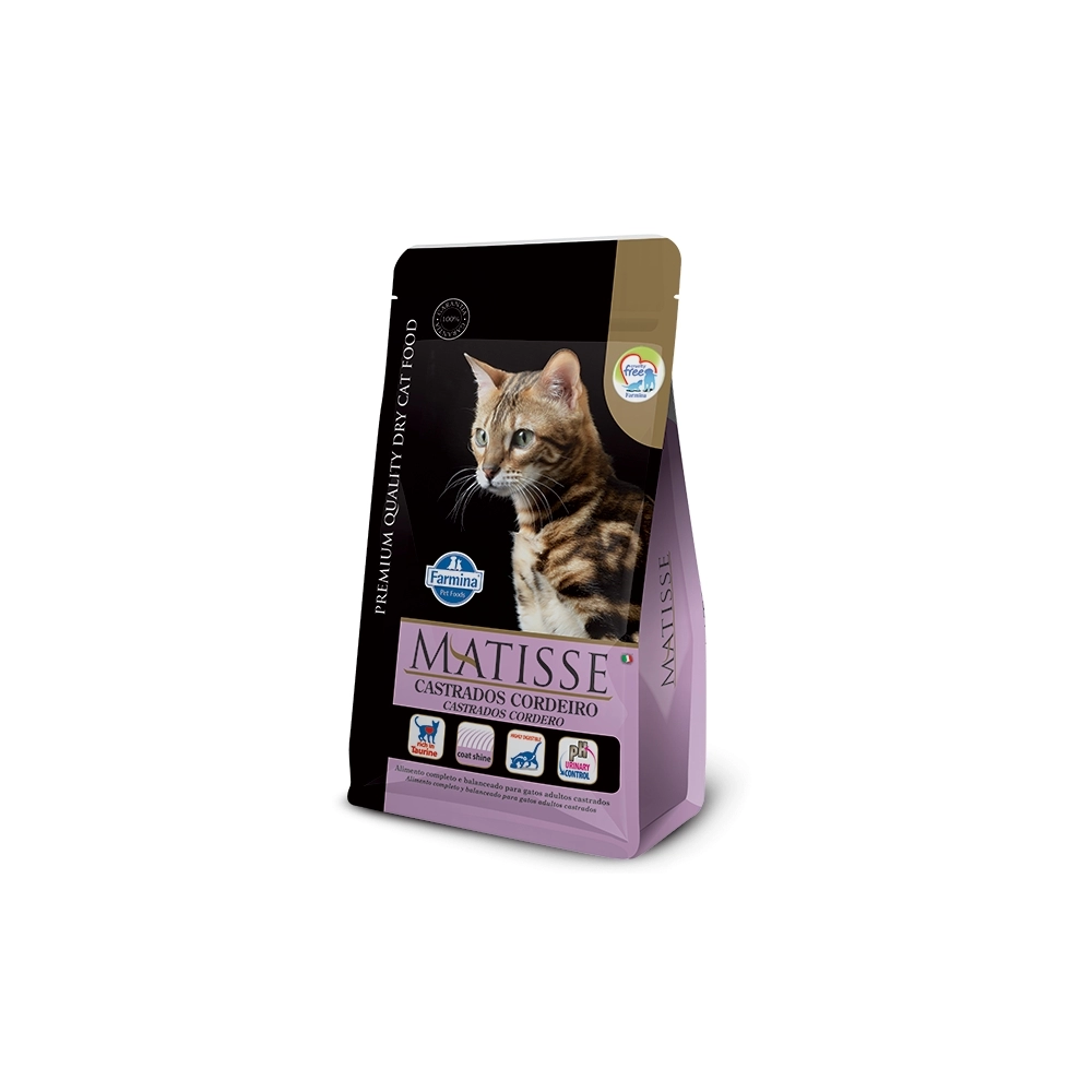 Matisse Castrados Cordeiro é um alimento completo e balanceado desenvolvido especialmente para atender as necessidades de gatos castrados. A castração traz mudanças importantes no metabolismo do gato e uma dieta adequada se faz necessária. Por esse motivo, Matisse Castrados Cordeiro foi formulado para auxiliar no controle do peso e, ao mesmo tempo, manter a massa muscular através de maior conteúdo de proteína e adição de carnitina.