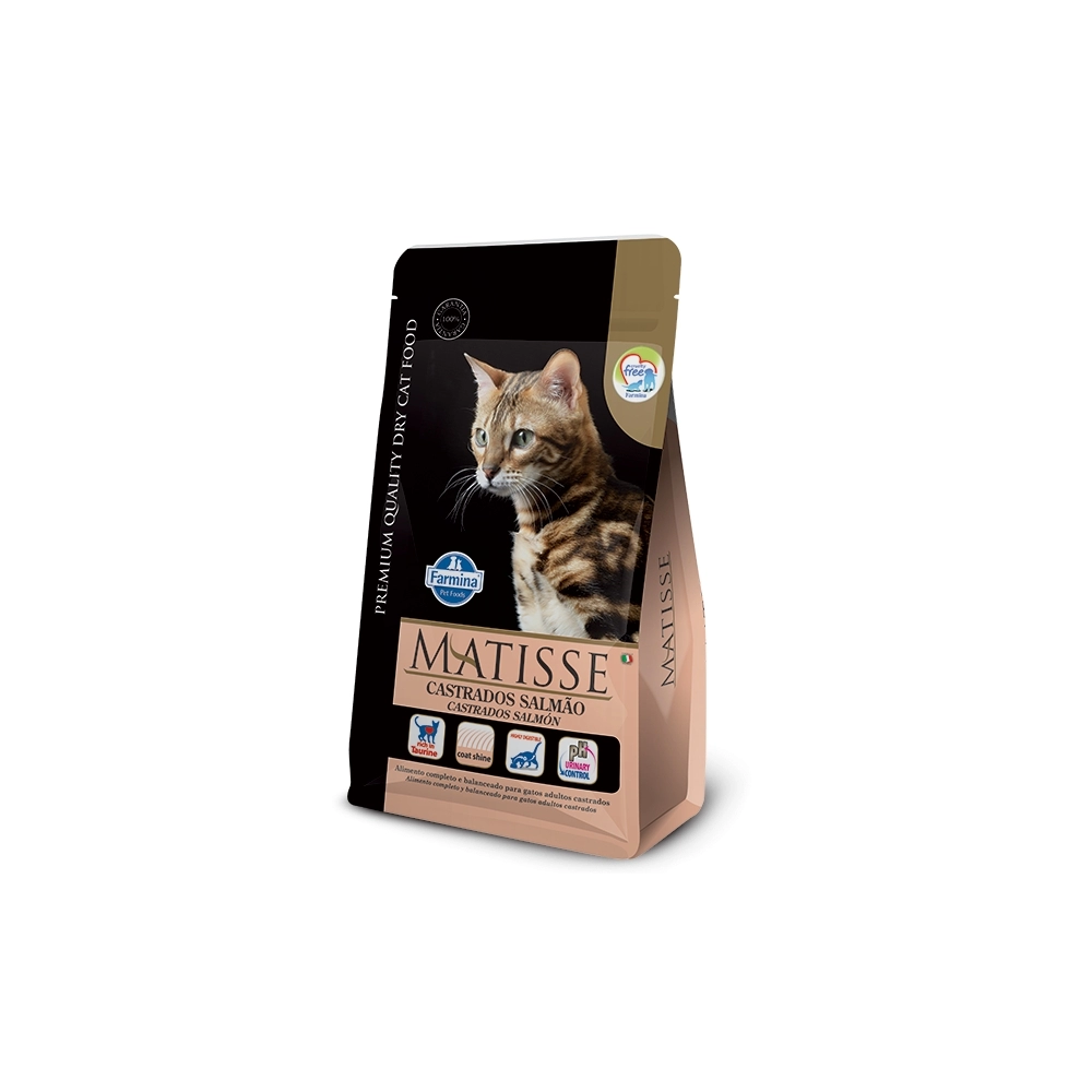Matisse Castrados Salmão é um alimento completo e balanceado desenvolvido especialmente para atender as necessidades de gatos castrados. A castração traz mudanças importantes no metabolismo do gato e uma dieta adequada se faz necessária. Por esse motivo, Matisse Castrados Salmão foi formulado para auxiliar no controle do peso e, ao mesmo tempo, manter a massa muscular através de maior conteúdo de proteína e adição de carnitina.