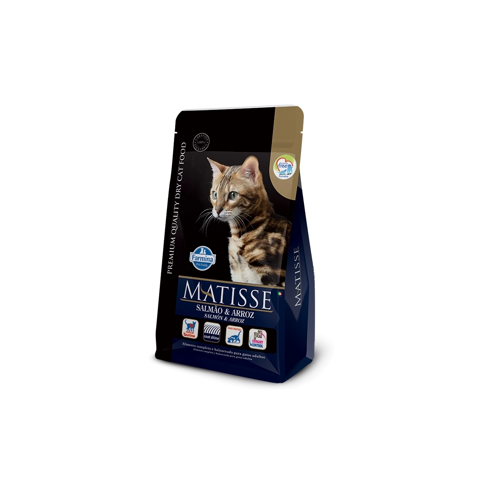 Matisse Salmão & Arroz é um alimento completo e balanceado para gatos adultos com nível de atividade física normal.