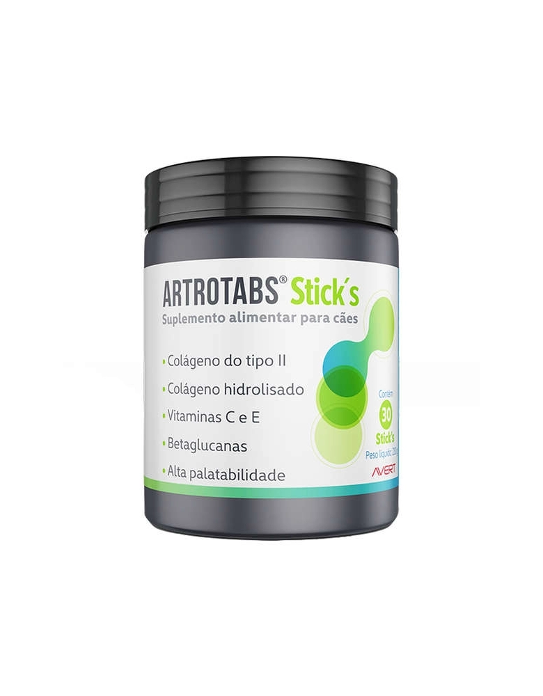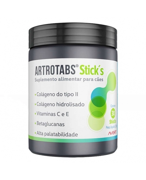 Suplemento Alimentar Avert Artrotabs Stick's para Cães conta com uma composição com nutrientes que são essenciais às articulações. Recomendado para cães que se beneficiem do aporte destes nutrientes. Contém cheirinho de churrasco e alta palatabilidade, contribui para a complementação nutricional do seu amiguinho.