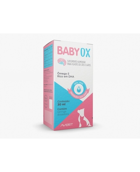 O Baby OX é um suplemento de Ômega 3 rico em DHA, auxiliando no desenvolvimento cognitivo e visual dos cães e gatos. Conta também com EPA para a boa saúde do coração e da circulação sanguínea.