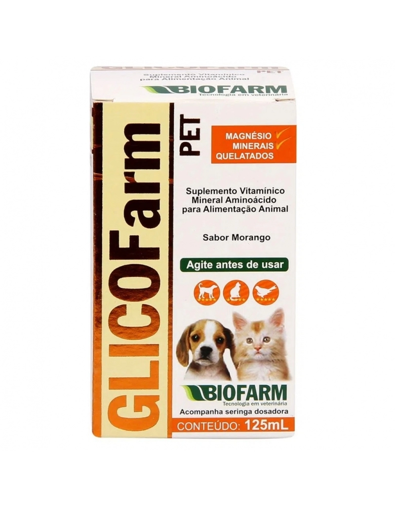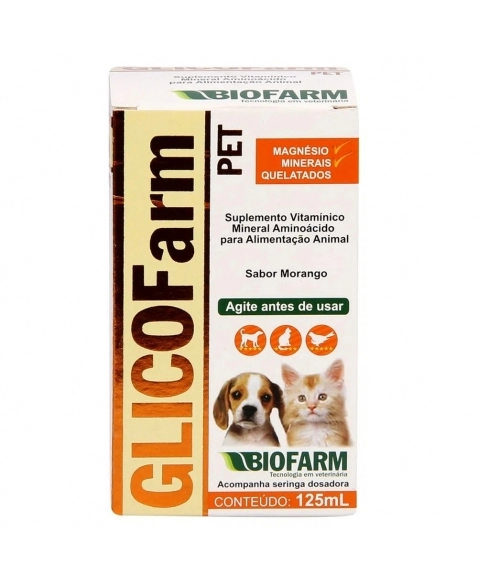 GLICOFarm Pet é um suplemento de aminoácidos, minerais quelatados e vitaminas do complexo B para cães, gatos, aves, répteis, roedores e afins. Auxilia na melhora do estado geral em casos de animais debilitados e atua como energético. Indicado no preparo de animais para exposição e cães em treinamento.