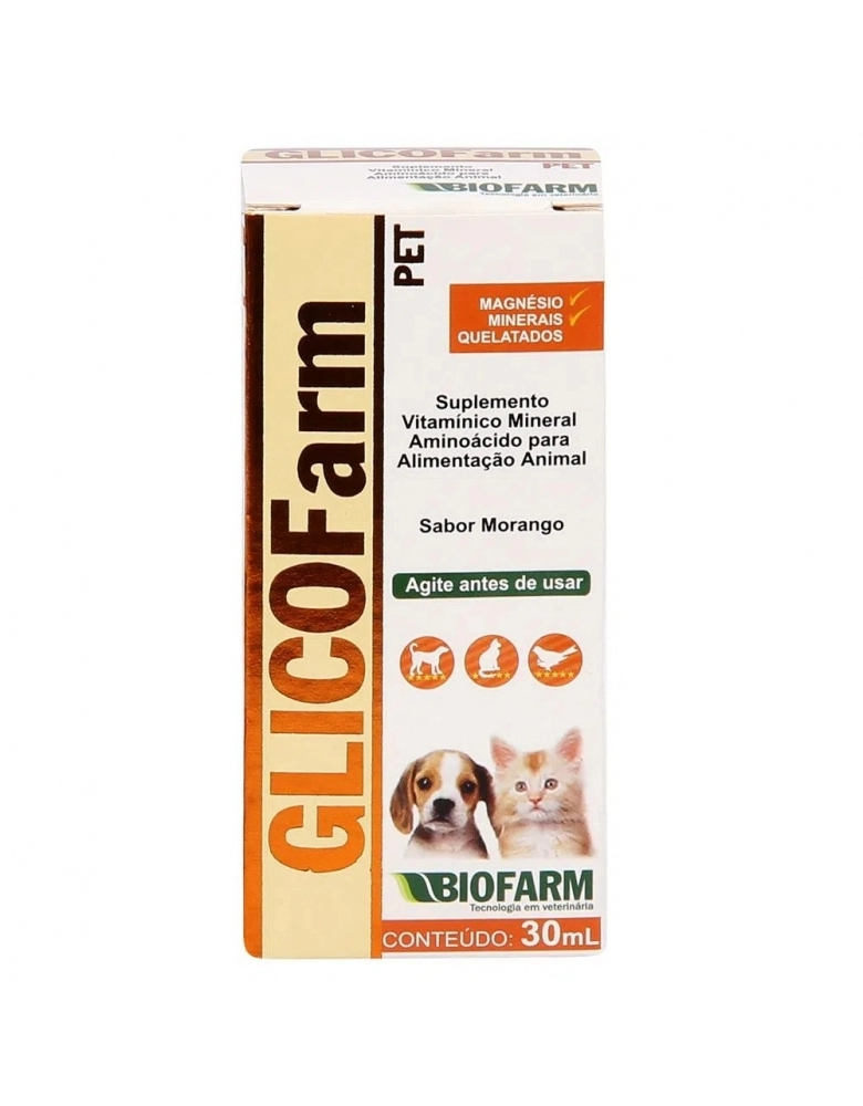 GLICOFarm Pet é um suplemento de aminoácidos, minerais quelatados e vitaminas do complexo B para cães, gatos, aves, répteis, roedores e afins. Auxilia na melhora do estado geral em casos de animais debilitados e atua como energético. Indicado no preparo de animais para exposição e cães em treinamento.