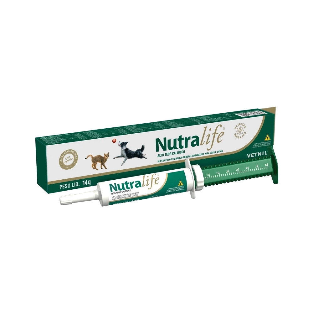 Nutralife® é um suplemento rico em calorias para o aporte nutricional para cães e gatos. Contém macro e microminerais, vitaminas hidro e lipossolúveis, aminoácidos essenciais e não-essenciais, Ômegas 3 e 6, glicose e prebióticos (MOS e FOS). A apresentação em pasta e o sabor carne conferem ótima aceitação e favorecem a absorção dos nutrientes da fórmula, sendo, portanto, um produto fundamental no caso de animais que necessitam de apoio nutricional imediato e eficaz.