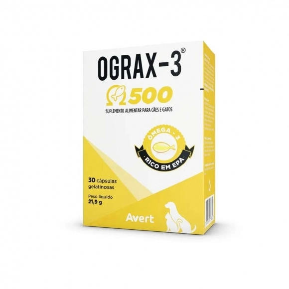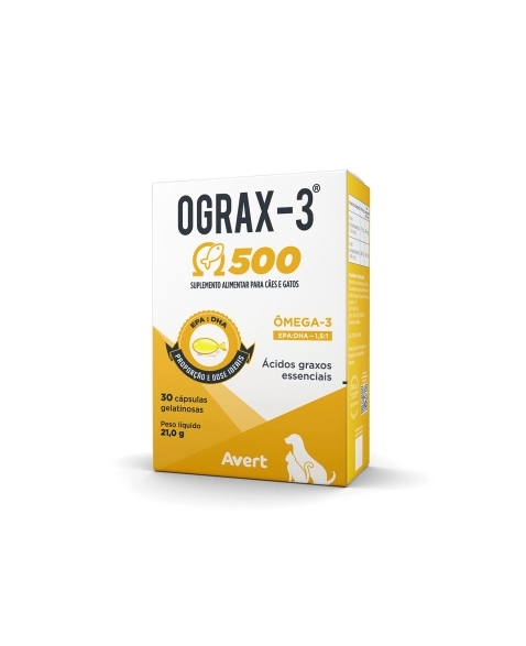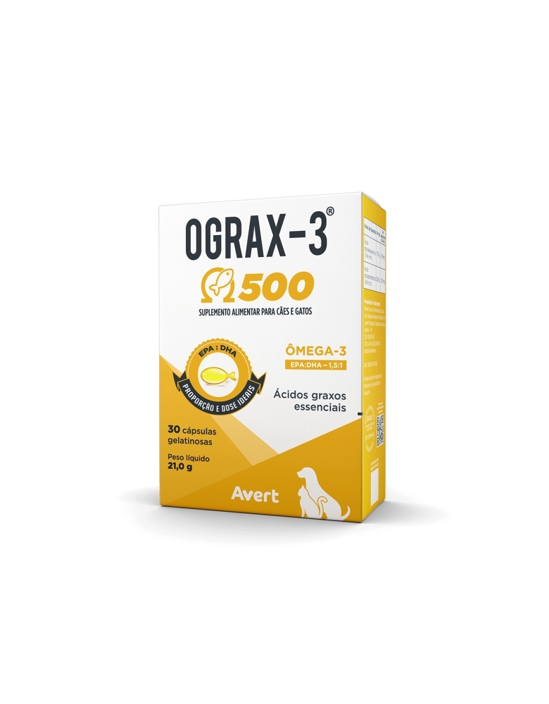OGRAX–3® 500 é um suplemento alimentar composto por ácidos graxos essenciais derivados de peixes marinhos. É indicado para cães e gatos que necessitem do aporte desses nutrientes.