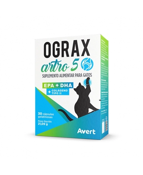 OGRAX ARTRO 5 é um suplemento alimentar composto por nutrientes essenciais às articulações. É indicado para gatos que necessitem do aporte desses nutrientes.