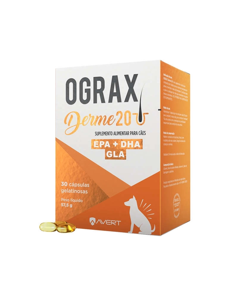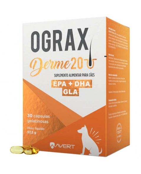 OGRAX DERME 20 é um suplemento alimentar composto por ácidos graxos essenciais derivados de peixes marinhos e óleo de borragem.