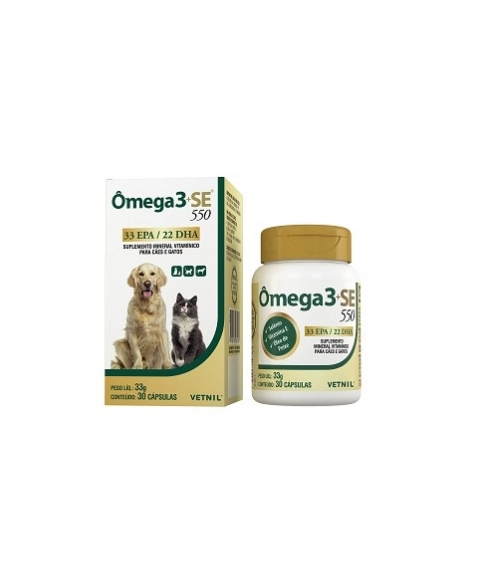 Omega 3+SE 550 é indicado para cães e gatos que necessitem da suplementação de ácidos graxos essenciais EPA e DHA. Além do ômega 3, possui em sua composição também vitamina E e o Selênio, que são potentes antioxidantes. A cápsula opaca ajuda a preservar as características do produto, garantindo sua qualidade.