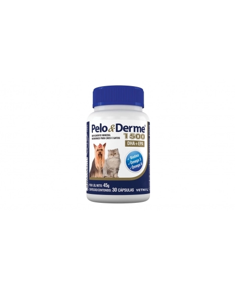 Pelo & Derme DHA + EPA 1500 foi desenvolvido através de uma fórmula revolucionaria e equilibrada. Contém os principais ácidos graxos essenciais à dieta dos pets. Os ingrediente reunidos atuam de forma a manter as características morfológicas, plásticas e funcionais da pelagem e da pele.