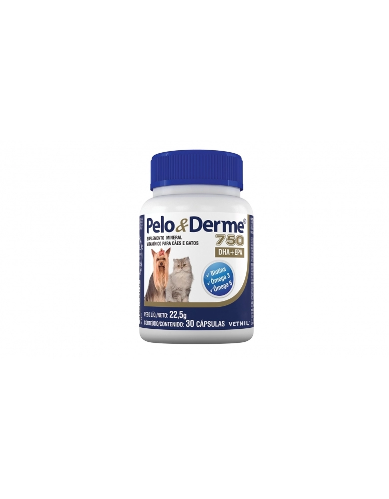 Pelo e Derme 750 DHA + EPA é um suplemento que atua na derme e pelos de cães e gatos, para diminuir a queda de pelos e fortalecer a pele e pelos dos animais.