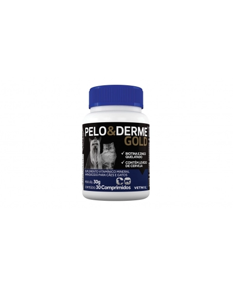 Pelo & Derme Gold é um suplemento contendo vitaminas, ômegas, aminoácidos, leveduras e zinco para cães e gatos. Indicado para o fortalecimento e manutenção da estrutura e função da pele e pelos dos animais.