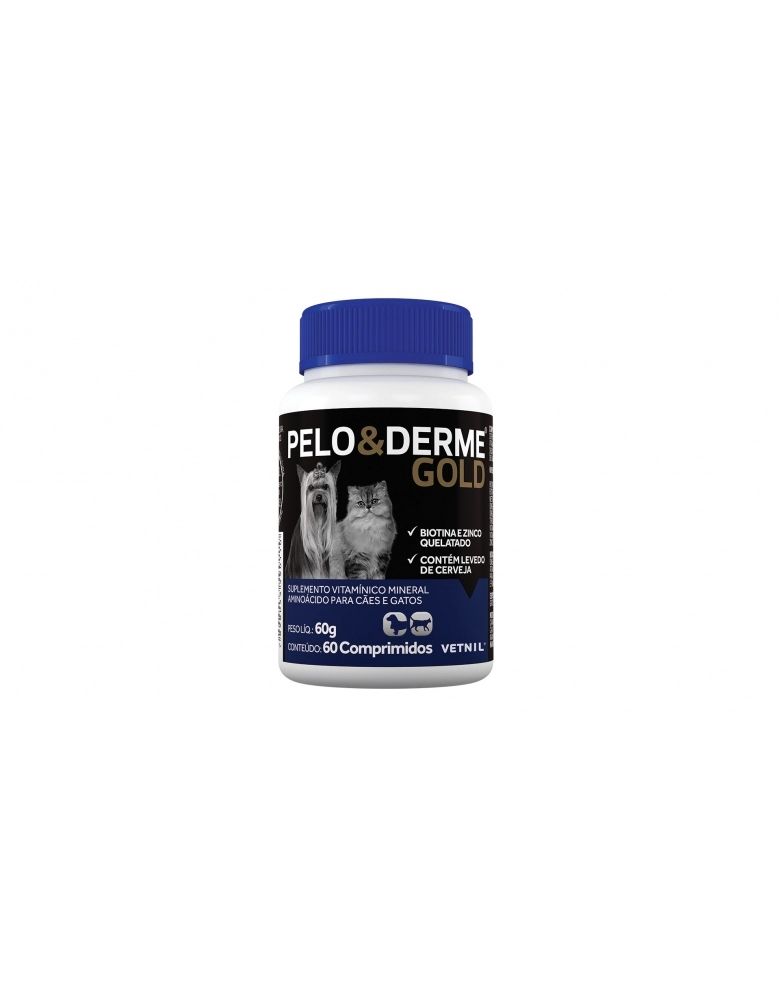 Pelo & Derme Gold é um suplemento contendo vitaminas, ômegas, aminoácidos, leveduras e zinco para cães e gatos.