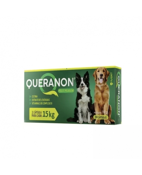 QUERANON® é um suplemento vitamínico-aminoácido, indicado para auxiliar na prevenção da queda de pelos em cães de qualquer idade.