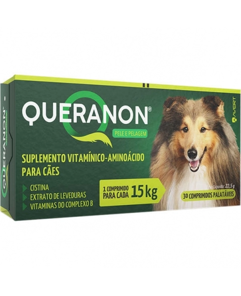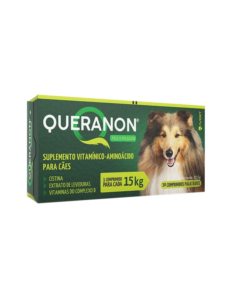 QUERANON® é um suplemento vitamínico-aminoácido, indicado para auxiliar na prevenção da queda de pelos em cães de qualquer idade.