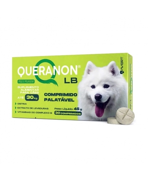 QUERANON® LB é um suplemento vitamínico-aminoácido, indicado para auxiliar na prevenção da queda de pelos em cães de grande porte de qualquer idade.
