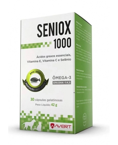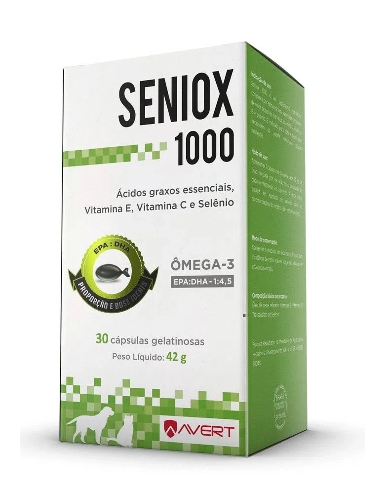 O Suplemento Avert Seniox é compostos por ácidos graxos essências (rico em DHA) derivado de peixes marinhos, vitamina C, vitamina E e selênio quelatado. Indicado para cães e gatos em qualquer idade.